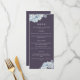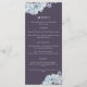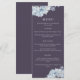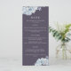 Un menu de mariage élégant avec des fleurs d'hydrangée bleu poussiéreux sur un arrière - plan bleu marine, personnalisées avec vos noms et votre date de mariage. Les détails du menu sont en blanc.