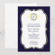 Le bleu marine et en filigrane jaunes/brocard encadrent le faire-part de mariage comportant un monogramme
