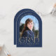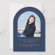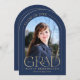 Cette faire-part de graduation minimaliste marine bleu et or simple arche dispose d'un cadre arche délicat, 2 modèles photo et élégante typographie moderne.