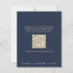 Invitation de mariage bleu marine pour un budget abordable. L'avant présente "Happily Ever After Party" dans un mélange de typographie or simple et un élégant script or avec des swashes et vos noms dans un script signature. Au contraire, ajoutez l'adresse de votre site Web mariage pour créer un code QR que les invités peuvent scanner pour suivre vos photos mariages, tous les détails et RSVP en ligne, et ajoutez vos prénoms et vos dates de mariage et de réception.