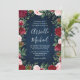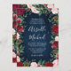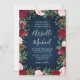 Navy Marsala Country Rustic Wedding Invitations - dispose d'un arrière - plan rustique en bois bleu marine avec verdure, roses et autres éléments floraux dans les tons rose roux, marsala, bordeaux et plus. REMARQUE : cette invitation est prédimensionnée à 5 x 7 pouces. Un modèle de 4,5 x 6,25 pouces est également disponible dans cette conception. Afficher la collection trouvée sur cette page pour ce produit.