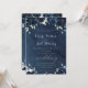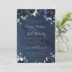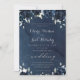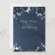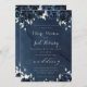 Une suite marine de faire-part de mariage avec un arrière - plan bleu marine à l'aquarelle en cascade avec des fleurs de marine et de pivoines blanches et de la végétation d'eucalyptus argenté. Une élégante calligraphie de police swash met en évidence la suite d'invitations et de papeterie accessoire.