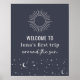 Un arrière - plan de la Marine avec un contour de soleil, avec la typographie "premier voyage autour du soleil" avec le nom de votre enfant. Le long du fond, il y a une étoile et un motif de lune. Parfait pour la fête de votre petit-fils !