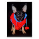 Portrait adorable photo d'un petit chiot portant un pull en laine rouge et bleue doux avec des poms de pom.