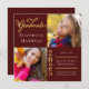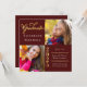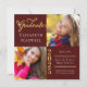Elégant et classe marron carré et ton or, deux faire-part de remise de diplômes photo et design d'invitation à la fête. Comprend le mot "Graduate" dans l'art texte en or scripté et l'année "2025" dans l'art texte en or vertical sur le devant avec vos photos dans les coins opposés. Des champs sont fournis pour le nom du diplômé, la date de fin d'études, l'école, le collège ou l'université et les plans d'avenir sur le front. À l'arrière est une coordination de la conception d'invitation de la fête de graduation, également avec des accents de ton or. Design par Holiday Hearts Designs (droits réservés).