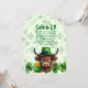 Invitation à la fête d'anniversaire irlandaise avec des clovers à bull et à quatre feuilles. Le nom et l'âge sont en haut. Le texte de l'invitation de partie se trouve dans un paragraphe de police verte imprimée. Des trèfles à quatre feuilles ornent l'arrière - plan et le fond, avec un pot d'or à côté d'un taureau portant un casquette vert. Le haut de l'invitation est courbé, avec d'autres options à choisir. Aussi ce Mars / modèle de fête de la Saint Patrick peut être téléchargé pour un prix pour utiliser autant que nécessaire.