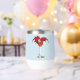 Un mignon petit dragon rouge se dresse jusqu'à une olive verte dans un verre de martini