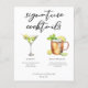 Cette liste de cocktails chic et signature propose une typographie noire simple au-dessus de 2 boissons et leurs ingrédients pour votre bar mariage. Un joli dessin à base de Martini et de mule moscovite ajoute une touche cool à votre menu du bar. Complétez avec les noms du couple et la date de leur réception.