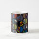 Cette tasse a un design moderne du milieu du siècle de moitiés ovales, certaines solides et certaines rayées, dans les couleurs masculines sur un champ de gris foncé.