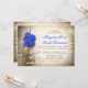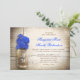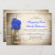 de belles invitations de mariage rustiques avec arrière - plan en bois en détresse et bocal de mason avec fleurs de couleur bleue royale. Je suggère un beau papier de texture de lin pour ce design.