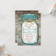 Rustic Country Mason Dîner de répétition de jarre Invitations avec un accent bleu turquoise sur un arrière - plan imprimé en bois de grange.