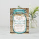 Rustic Country Mason Jar Rehearsal Dîner Invitations avec un accent bleu turquoise sur un arrière - plan imprimé en bois de grange pour un thème mariage rustique.