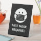 Masque facial obligatoire signe de vente au détail pour bureau ou table. Icône simple de logo de tête avec texte personnalisé. Infographie d'instructions simples pour le revêtement obligatoire du visage. Pratique pour les affaires, les toilettes, les salles de bain, les toilettes publiques, les restaurants, les boutiques, les espaces hygiéniques, les hôpitaux, les écoles, les bureaux, le lieu de travail, le café, le bar, le pub, etc. modèle de signalisation sociale avec symbole pour le port obligatoire du masque facial. Couleurs personnalisables. Aidez à arrêter la pandémie de CoronaVirus / COVID 19. Disponible en différentes tailles, de petite à grande. Placer sur la table, le bureau et d'autres endroits visibles. Exemple de couleur noir et blanc.