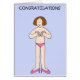 Illustration simple d'une dame debout dans des culottes roses et des chaussures roses, les mains recouvrant la moitié supérieure de son corps. L'image a un arrière - plan bleu pastel et le mot "Félicitations" est écrit au-dessus de l'image.