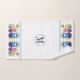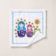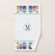 Matryoshka Poupées russes et tournesols design personnalisé avec un motif coloré de Matryoshka ou Matroska Poupées d'art populaire russe en bleu, vert et rose violet avec des fleurs et autour d'eux tournesols. La serviette à main comprend des bordures de poupées avec deux lignes bleues et votre monogramme tandis que le linge de toilette a une poupée au centre avec une bordure floue autour.