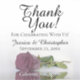 Ces beaux autocollants sont conçus comme des étiquettes miniatures de vin, de champagne ou de bouteille d'alcool. Elles présentent un design élégant avec une seule rose de couleur rose mauve à longue tige, réfléchissant dans un bassin d'eau. Le texte dit Merci pour célébrer avec est, et il y a de la place pour les noms du couple, la date du mariage, et le contenu de la bouteille.