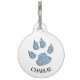 Paw print à paillettes bleues avec le nom du chien sur le devant sur fond blanc, au dos fond d'alerte rouge avec du texte blanc qui dit OH Snap ! Je suis perdu - Appelle ma mère, elle pleure laidement. Le fond rouge attire l'attention sur la balise pour que celui qui trouve le chien puisse voir l'alerte.