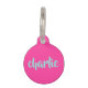 Balise d'identification d'animal de compagnie avec le nom de votre animal de compagnie dans une police de script bleu aqua sur un arrière - plan rose chaud avec le numéro de téléphone au dos. Design audacieux et coloré. Les polices et les couleurs sont personnalisables dans l'outil de conception.