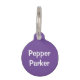Arrière - plan violet est présenté sur les deux côtés de cette étiquette ronde animal. Personnalisez le nom de l'animal sur le devant de l'étiquette et ajoutez votre numéro de téléphone au dos de l'étiquette pour aider à garder votre chien ou chat en sécurité. Tag est disponible en différentes tailles, fabriqué aux Etats-Unis!