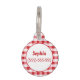 Illustration de fast food par Destei représentant un pain à hot dog avec une saucisse grillée surmontée de ketchup et de moutarde. Le fond présente un motif à carreaux rouges. De l'autre côté, il y a deux zones de texte personnalisables, l'une idéale pour le nom de l'animal de compagnie et l'autre pouvant être utilisée pour le numéro de téléphone du propriétaire.