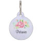 Un tag animal de compagnie personnalisé avec une belle et élégante aquarelle créé bouquet floral. Fleurs de jardin roses entourées de feuillage vert clair. Arrière - plan d'aquarelle violette.