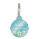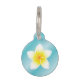 Cette étiquette pour animal de compagnie tropicale comporte l'illustration de dessin animé de Destei d'une belle fleur de frangipanier plumeria blanche et jaune sur un fond dégradé bleu. De l'autre côté, il y a des zones de texte personnalisables pour le nom de l'animal et le numéro de téléphone du propriétaire.