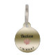 Empreinte de patte et faux or personnalisé marque d'identification pour animaux de compagnie sourds avec faux or arrière - plan métallique et look gaufrée, faux feuille rose empreinte de patte or. Nom de l'animal personnalisé en script noir. Lit 'I'M DEAF' en bas dans le texte courbe. Le dos a le numéro de téléphone avec le nom et les coordonnées personnalisées en animal de compagnie coque se perdent sur le cercle blanc facile à lire avec une bordure métallique en faux or. Note : Toutes les images sont imprimées. Pas de métal ou de feuille d'or réel.