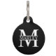 Gardez votre animal de compagnie en sécurité et ne perdez plus jamais avec cette balise animal de compagnie caractéristique monogramme blanc personnalisé dans le style de police serif classique avec boîte de nom au milieu du monogramme sur l'arrière - plan noir, avec les coordonnées du propriétaire sur le dos de la balise. Parfait pour vos chiens, chats et animaux de compagnie bien-aimés.