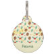 Un tag animal de compagnie avec un motif de Noël mignon avec des cônes de pin et un saint sur un arrière - plan d'aquarelle jaune avec des petits cercles blancs éparpillés autour. Une bordure jaune en bas avec le nom de votre animal à l'intérieur.