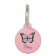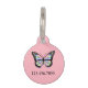 Un beau papillon se trouve au-dessus du texte affiché sur cette étiquette rose. Vous pouvez modifier le texte sur le devant pour afficher le nom de l'animal. Le texte à l'avant est un élégant script noir. Le papillon apparaît également à l'arrière, mais le texte affiché à l'arrière correspond à un numéro de téléphone.
