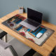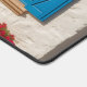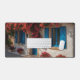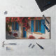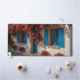 A beautiful desk mat featuring a charming Mediterranean-style house with bright blue windows, white walls, and vibrant pink flowers cascading around the doorway. This scenic design adds warmth, color, and a relaxing coastal village vibe to your workspace.