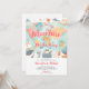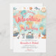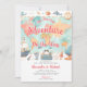 Une invitation pour baby shower fille mignonne qui est neutre du genre, avec un thème voyage et aventure, avec une aquarelle illustration de la carte du monde avec des personnages mignons et des éléments liés au voyage, avec le titre "Notre plus grande aventure est sur le chemin". Parfait pour les futurs parents qui aiment voyager, qui aiment le thème de l'aventure pour un baby shower.