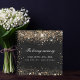 Un arrière - plan noir élégant avec de la poussière de parties scintillant en faux or. Avec le texte : Dans la mémoire aimante écrite avec un élégant script de style écrit à la main. Ajoutez un nom et des dates.