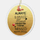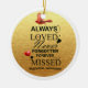 Cet adorable ornement de Noël commémoratif, intitulé ‘Toujours aimé, Jamais oublié, Manqué,’ fait un ajout poignant à votre sapin de Noël ou un don mémorial sincère pour chérir la mémoire de ceux qui vous sont chers et qui vous sont passés. Les cardinaux, souvent considérés comme le symbole de la présence d’un être cher, ajoutent une couche supplémentaire de signification à cette pièce. Parfait pour honorer des souvenirs chéris, cet ornement est un don significatif "en mémoire" et un souvenir réfléchi.