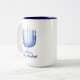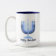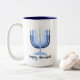 Ménorah design moderne avec "Happy Hanoukka" sur Mug 15oz. Impression recto verso avec menorah dos. Passe au lave-vaisselle.