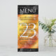 Ajoutez de la sophistication aux célébrations du 23e anniversaire de mariage topaze impériale avec ce menu de dîner, qui présente une écriture élégante et des confettis hexagonaux sur des fonds en moiré rouge-jaune-orange foncé et noir. Personnalisez avec les noms des couples, dates de mariage, détails du lieu, éléments de menu et messages de félicitations.