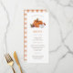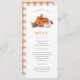 Ce menu de dîner d'action de grâce de citrouille d'automne élégant et mignon présente de belles citrouilles orange brûlé et blanches à l'aquarelle et des florales automnales avec un motif à carreaux buffle orange et blanc à l'arrière.