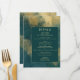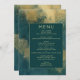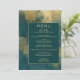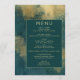 Cet élégant menu de mariage est doté d'un arrière - plan d'aquarelle abstrait moderne, bleu turquoise et or. Customisez le texte de couleur or dans des polices élégantes sur un rectangle turquoise foncé. L'arrière du menu reprend le design abstrait.