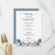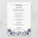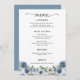 Améliorez votre réception de mariage avec ce menu Mariage floral couleur bleu clair classique, un ajout intemporel à vos paramètres de table. Avec ses tons bleu poussiéreux doux et ses motifs floraux délicats d'aquarelle, ce menu est parfait pour un mariage romantique classique, une fête florale moderne ou une expérience culinaire élégante. Entièrement personnalisable, il présente magnifiquement vos choix de menu tout en ajoutant de la sophistication à votre journée spéciale.