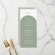 Présentez votre dîner de réception avec cette élégante carte de menu bohème, conçue pour coordonner avec la collection de mariage Rustique Arche Vert Sauge tout en offrant une touche fraîche sur le style signature. Le devant présente une simple courbe d'arche vert clair qui encadre gracieusement les détails de votre repas, y compris les apéritifs, les sélections de plats principaux et les desserts, le tout sur un fond ivoire blanc. Design rétro. Cette variation subtile crée un riche fond naturel qui met en valeur les informations de votre menu.