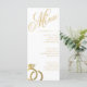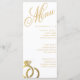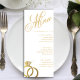 Elégant menu de réception de mariage blanc et or avec bague en diamant brillant. Personnalisez-le avec les détails de votre événement.