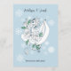 Un petit dragon blanc se tient au milieu de roses blanches contre un arrière - plan bleu clair doux aux délicats flocons de neige.