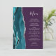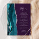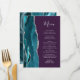 Le bord gauche de ce menu de mariage moderne élégant présente une bordure d'agate aquarelle bleu sarcelle ornée de faux paillettes d'argent. Le texte personnalisable combine une écriture manuscrite argent gris et des polices copperplate sur un fond violet. Le verso présente un dessin assorti d'agate bleu sarcelle et argent.