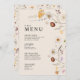 Les cartes de menu de mariage sont caractérisées par un style bohème, des illustrations florales et des couleurs beige, avec un mélange de différents styles de police, souvent de différentes tailles, pour créer un look unique et éclectique qui fait ressortir l'esthétique naturelle de ce menu.