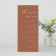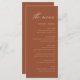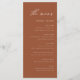 Ajoutez un accent élégant à votre paysage de table d'événements avec cette carte de menu personnalisable. Il présente un script fantaisiste et une typographie simple. Personnalisez cette carte de menu boho en ajoutant vos propres détails. Cette carte en terre cuite et blanche est parfaite pour les mariages, les douches nuptiales, les baby showers, et bien plus encore.
