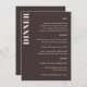 These personalized dinner menu signs in brown help guests easily follow the meal courses at a wedding reception, rehearsal dinner, or formal celebration. Customize the layout with your menu details to coordinate with your table settings, place cards, and signage. The clean, modern typography works well for plated dinners, multi-course meals, and catered events where clarity and style both matter. A great choice for couples planning a polished reception and looking for signage that feels cohesive and intentional.