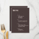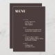 This wedding menu card features a rich brown background with ivory typography and a clean, easy-to-read layout for reception tables. Customize the wording to list appetizers, dinner options, and dessert so guests know what to expect throughout the meal. The vertical format works well for plated dinners, buffets, or family-style receptions. A polished paper detail that complements modern and minimalist wedding decor.