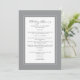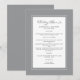 La conception de la carte de menu de mariage grise et blanche ultime présente une belle bordure chic grise qui comprend une élégante bordure blanche petite. La calligraphie et le script sont gris charbon sur fond blanc. Un modèle moderne comprend les noms des mariés, la date du mariage et un menu éditable, le tout dans une calligraphie tendance unique avec une conception de script. REMARQUE : La date du mariage affichée comme indiqué utilise la barre verticale ou ligne qui peut être trouvée au-dessus du \ sur un clavier ou sur votre appareil intelligent avec les caractères spéciaux. Vous pouvez également personnaliser avec n'importe quel autre caractère de votre choix.] Le dos de la carte est gris uni. Contactez-nous à InvitationSuites@gmail.com pour toute question ou demande spéciale !
