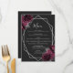 Cet élégant menu mariage moderne présente un cadre géométrique argenté décoré de bouquets de fleurs bordeaux et argentés sur un arrière - plan noir. Le texte personnalisable combine écriture fantaisie gris argenté, cuivre et polices italiques. L'envers est noir solide.
