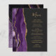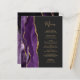 Le bord gauche de cet élégant menu mariage moderne comporte une bordure d'aquarelle violette ornée d'une parties scintillant en faux or. Le texte personnalisable combine un script d'écriture manuscrite de couleur or et des polices de cuivre sur un arrière - plan non noir. L'envers est assorti d'une agate violette et dorée.